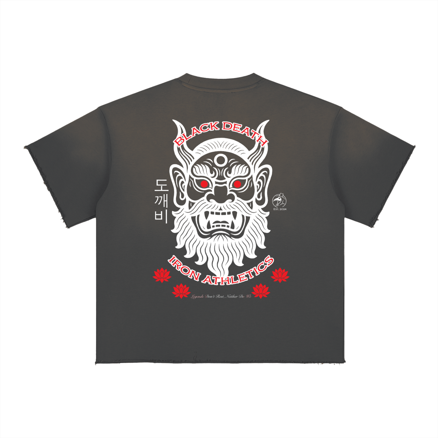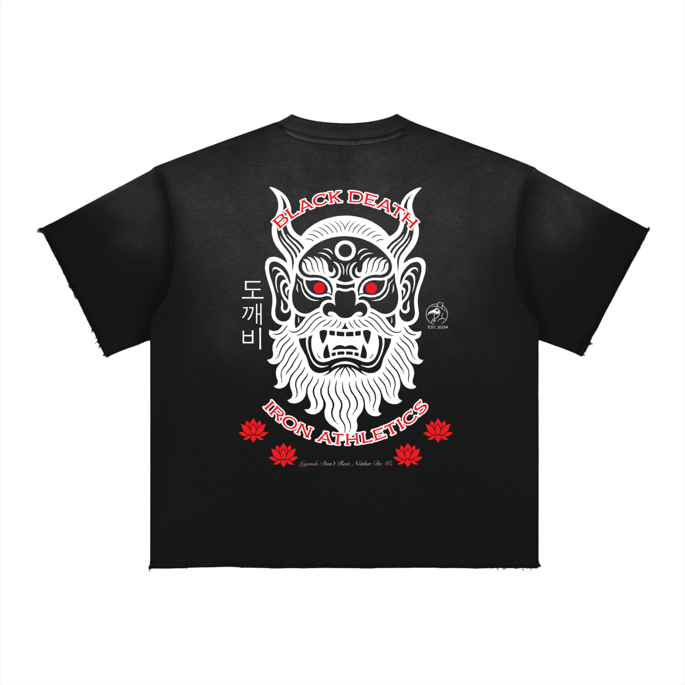 The Dokkaebi – Raw Edge Tee embodies this duality of chaos and wisdom. The front spiral design captures the eternal balance between wealth, power, luck, and mischief, while the back features a traditional Dokkaebi mask symbolizing both the protector and the challenger — the force that builds warriors through struggle.