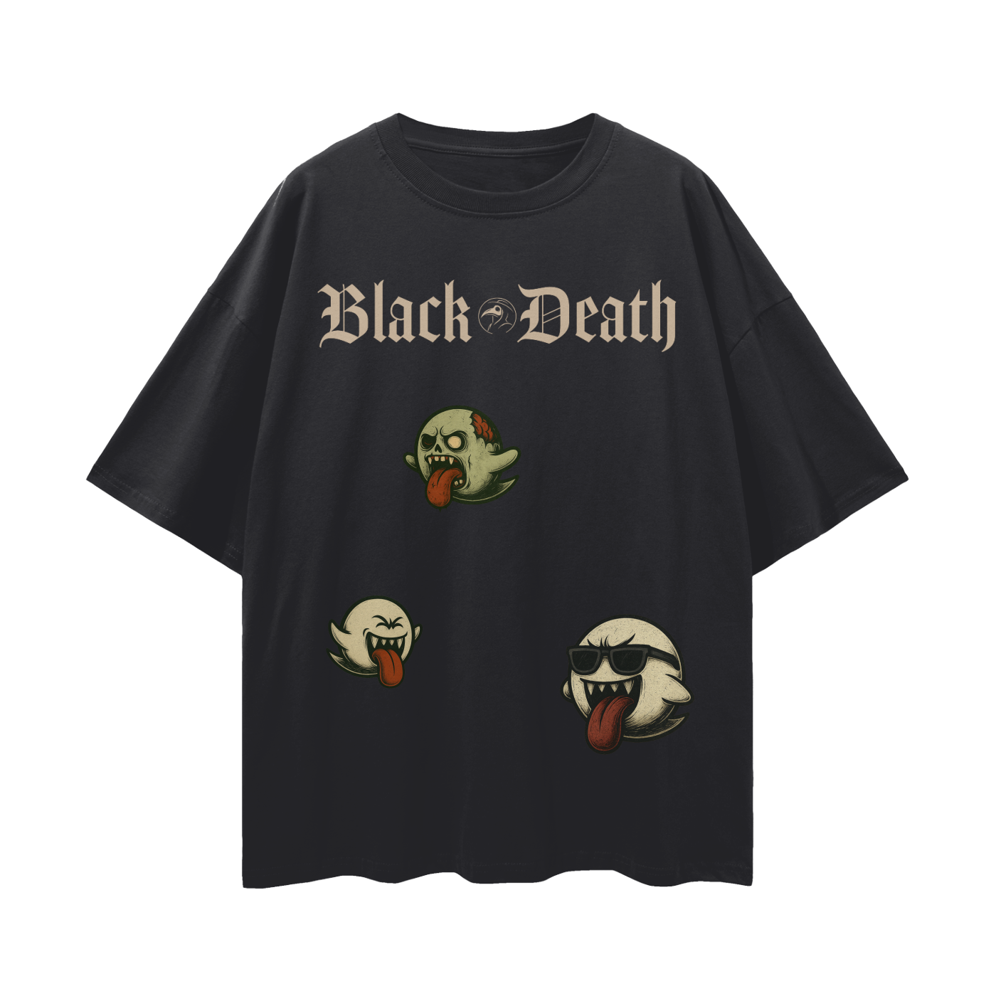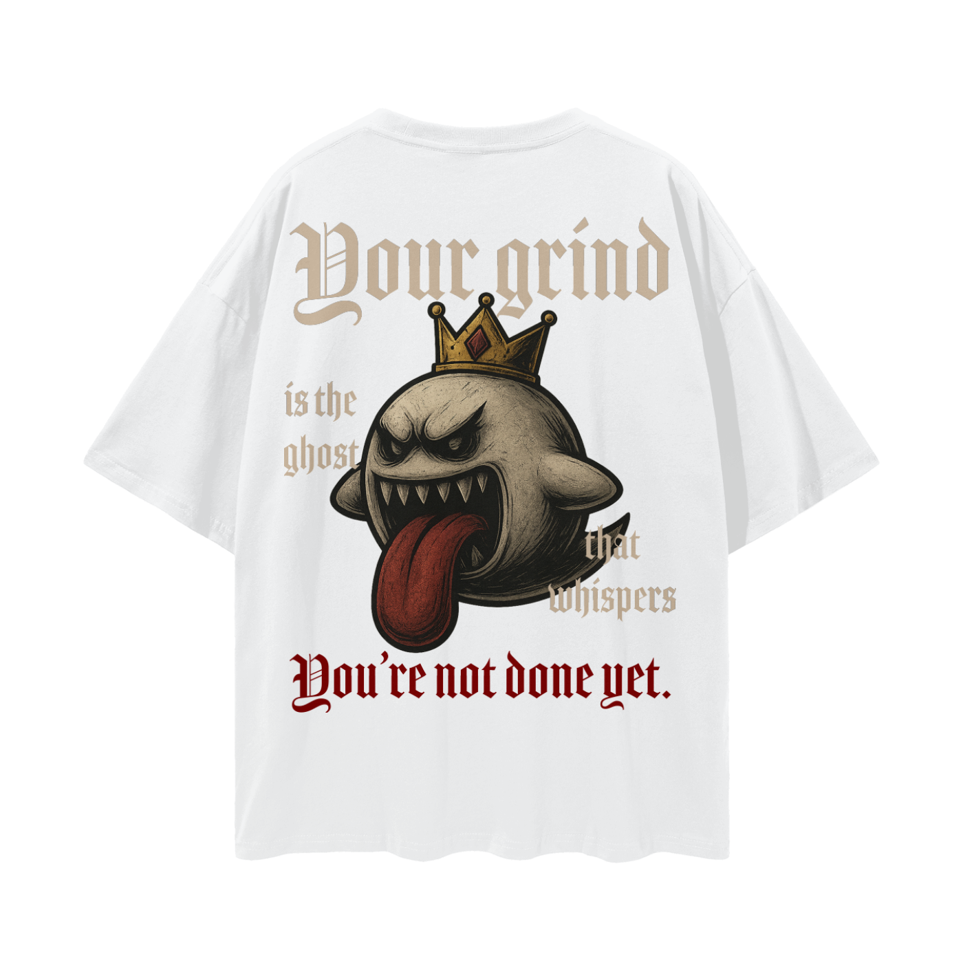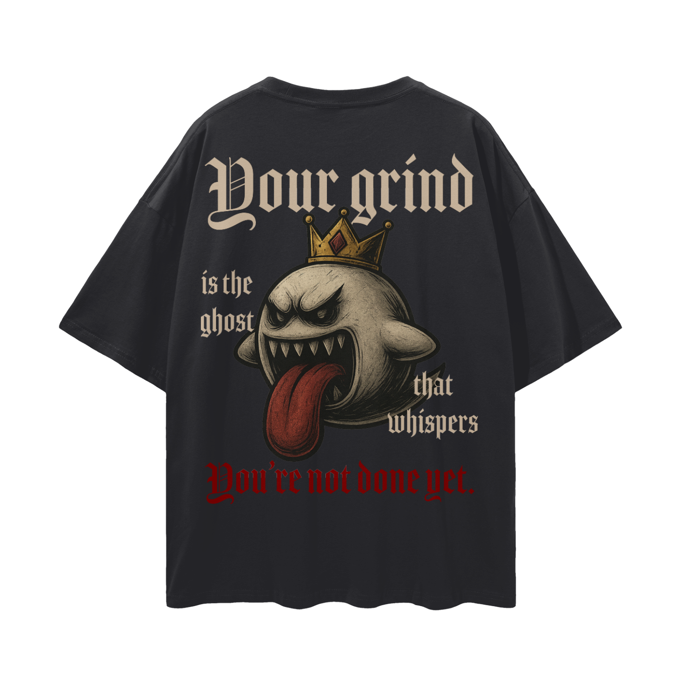 Part of our Halloween Edition. Lightweight and oversized for ultimate comfort, this Halloween drop tee features the Black Death logo with ghost graphics on the front and a crowned ghost on the back with the reminder: “Your grind is the ghost that whispers you’re not done yet.”