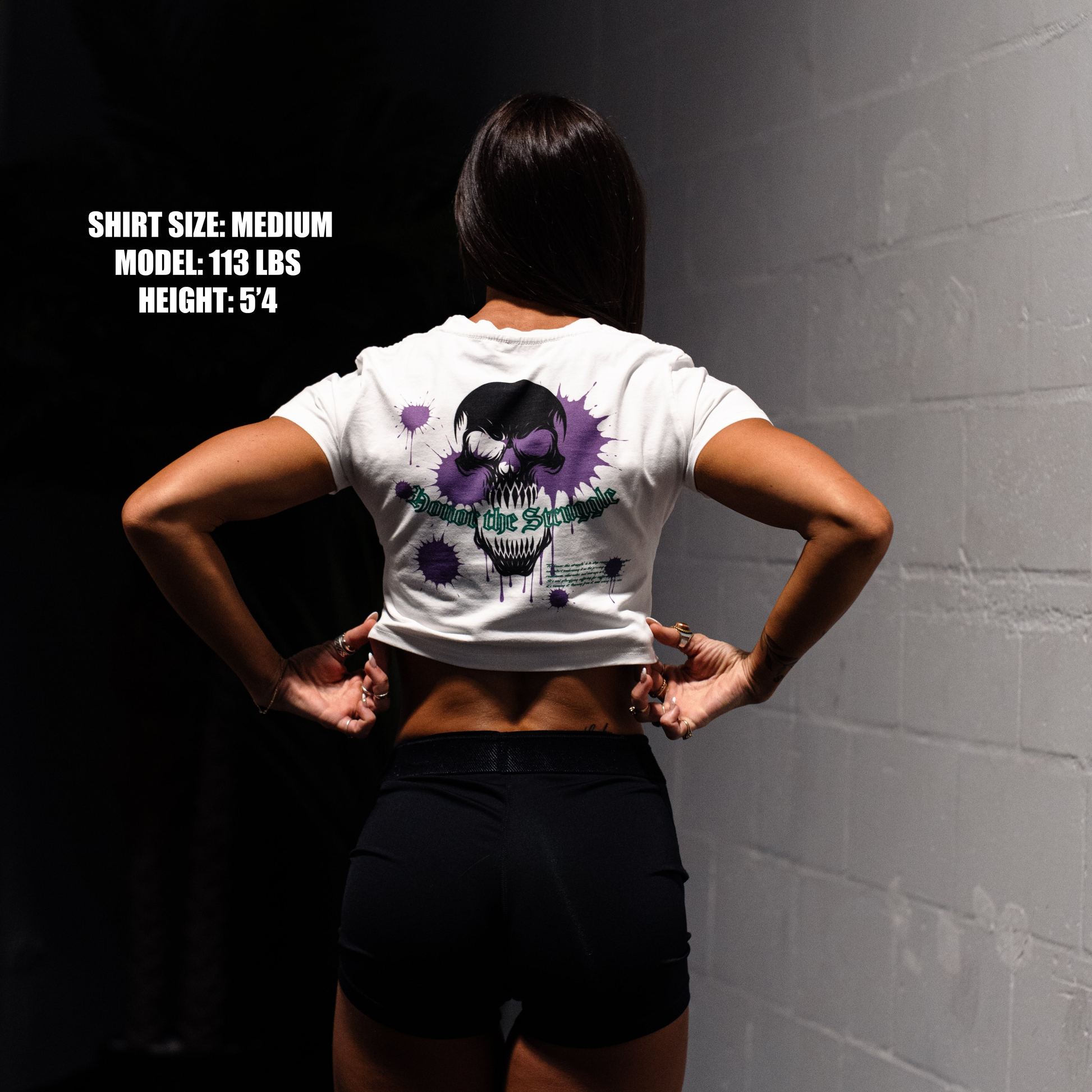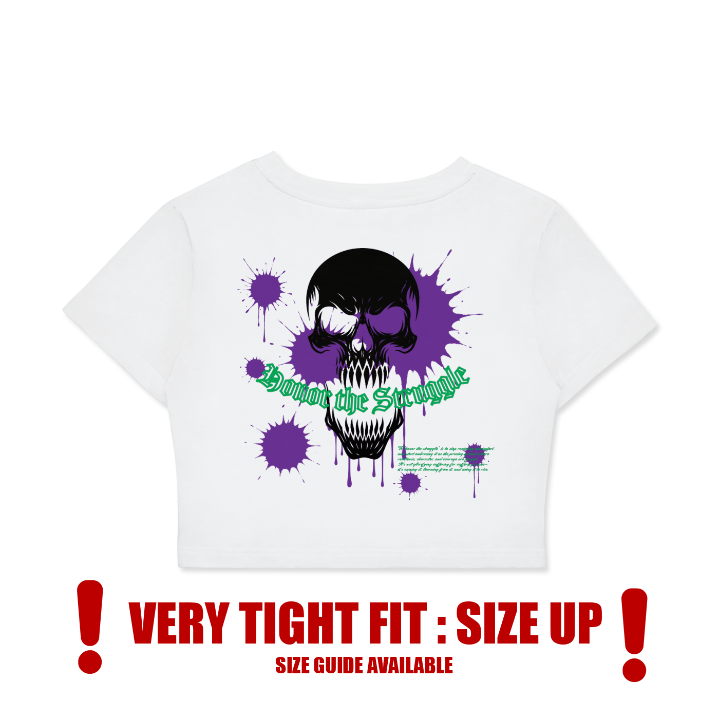 ( VERY VERY TIGHT FIT • SIZE UP ) Step into strength and style with the Black Death Grimm Belle Edition Crop Tee — a bold fusion of resilience and aesthetic edge. Featuring a striking skull and ink-splatter graphic with the phrase “Honor the Struggle” on the back, and a gothic Black Death logo with dripping accents on the front, this crop tee is built for women who embrace the grind. The design is powered by the message: “To honor the struggle is to stop resenting discomfort and start embracing it as the proving ground where resilience, character, and courage are forged… owning it, learning from it, and using it to rise.”